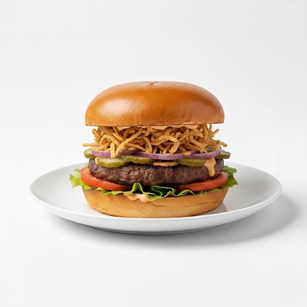 Beef Burger mit roten Zwiebeln, Röstzwiebeln, Essiggurken, Salat, Tomaten und Illeone-Sauce