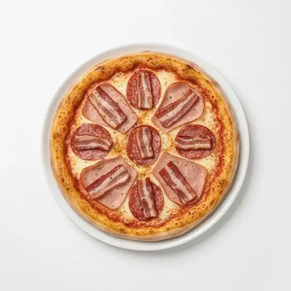 Tomatensauce, Mozzarella, Vorderschinken, Salami, Speck, Oregano